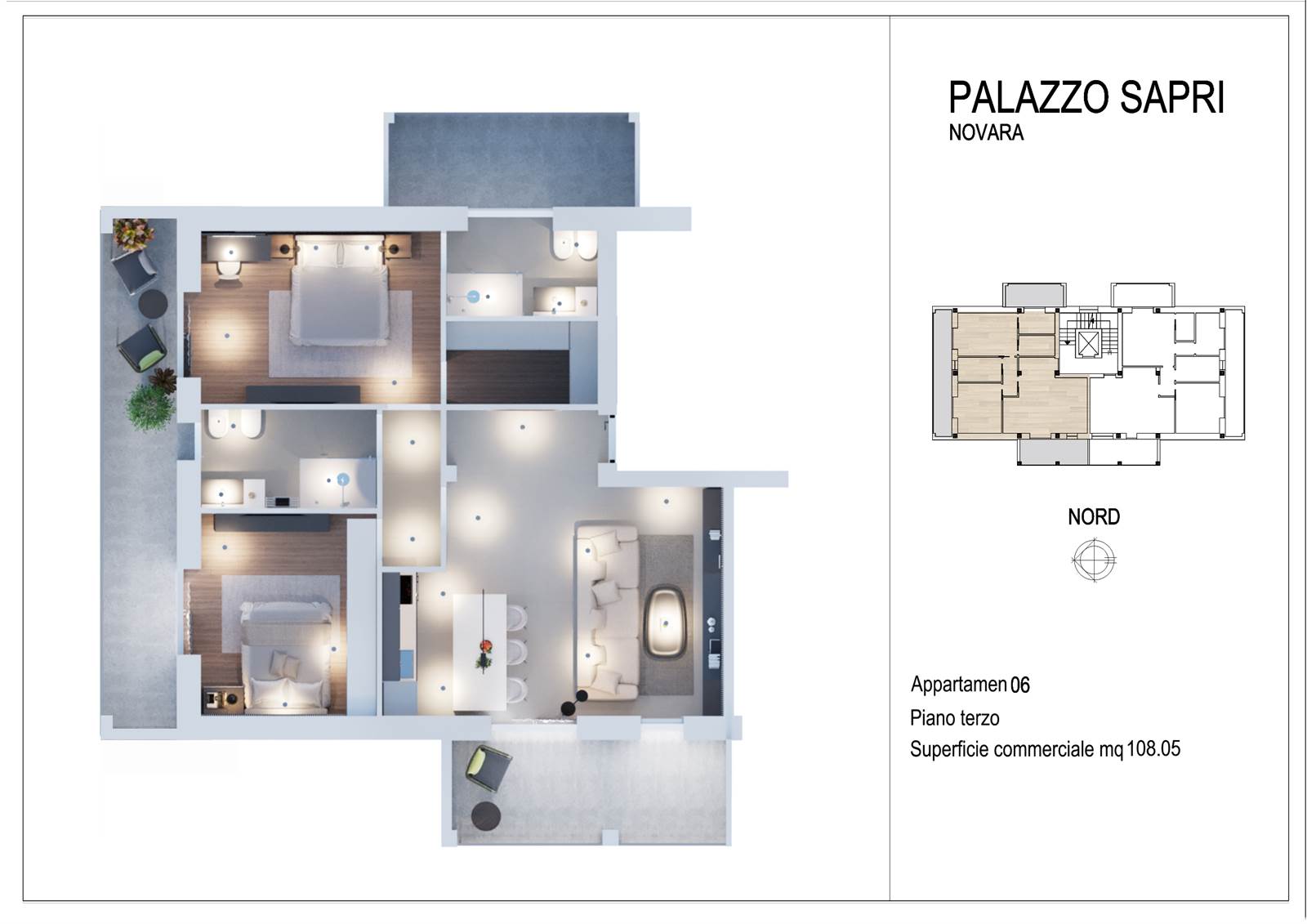 Lo stesso è composto da: soggiorno con cucina a vista, disimpegno, due camere, bagno (finestrato), due balconi e giardino.